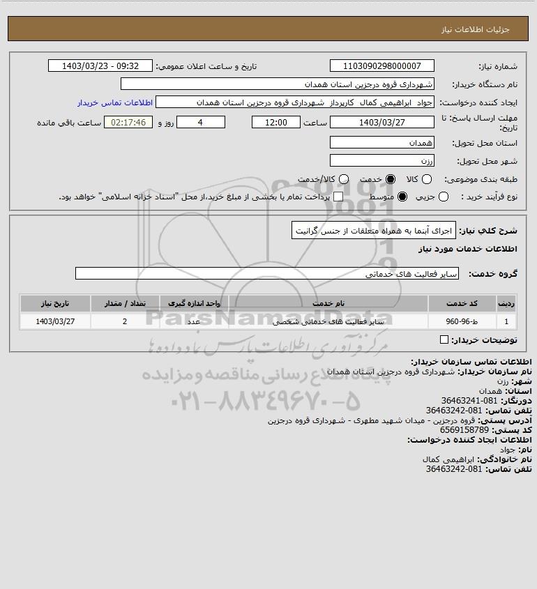 شرح کلی نیاز: اجرای آبنما به همراه متعلقات از جنس گرانیت