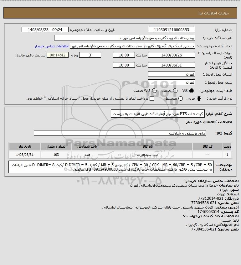 شرح کلی نیاز: کیت های PTS مورد نیاز آزمایشگاه طبق الزامات به پیوست