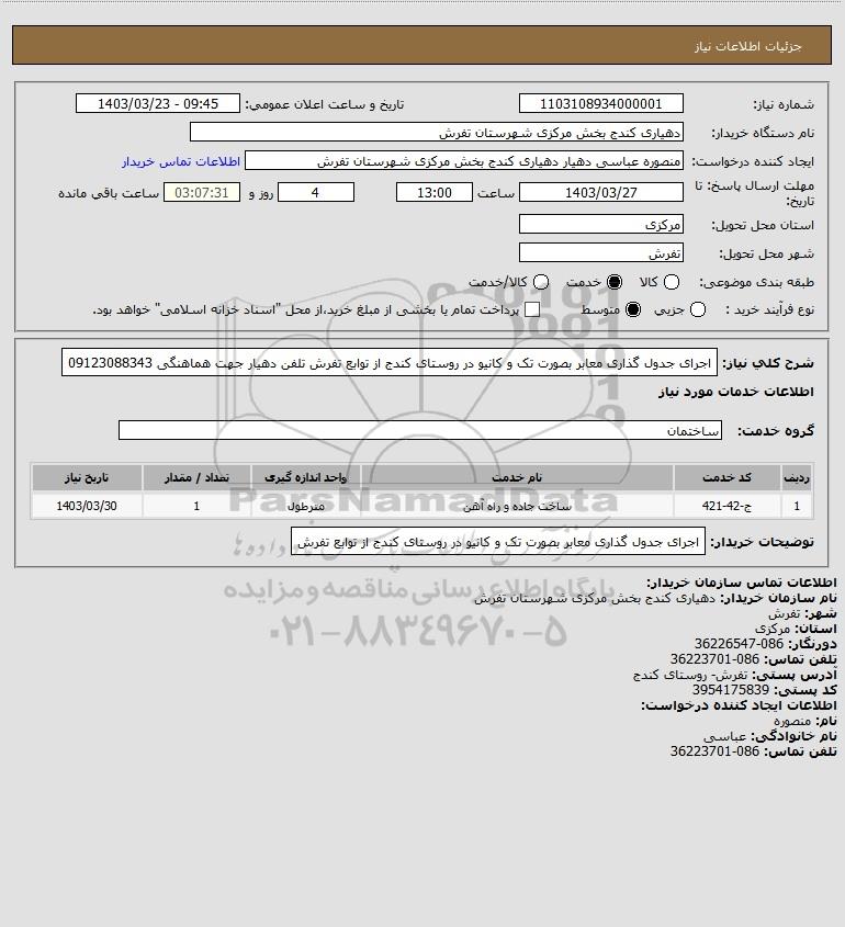شرح کلی نیاز: اجرای جدول گذاری معابر بصورت تک و کانیو در روستای کندج از توابع تفرش تلفن دهیار جهت هماهنگی 09123088343