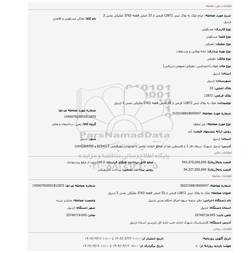 شرح مورد معامله: حراج ملک به پلاک ثبتی 12872 فرعی از 33 اصلی قطعه 3763 تفکیکی بخش 3 اردبیل | نام کالا: اماکن مسکونی و اقامتی | |