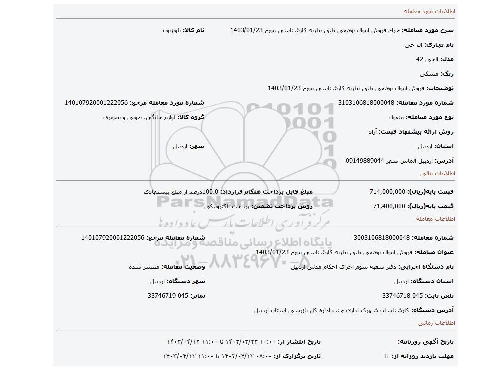 شرح مورد معامله: حراج فروش اموال توقیفی طبق نظریه کارشناسی مورخ 1403/01/23 | نام کالا: تلویزیون | |