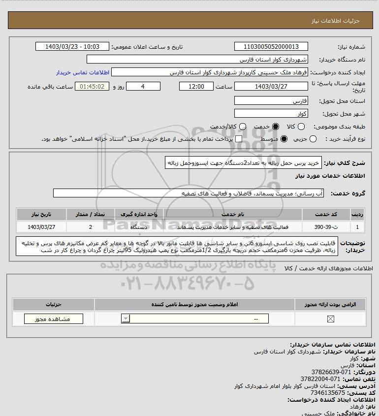 شرح کلی نیاز: خرید پرس حمل زباله به تعداد2دستگاه جهت ایسوزوحمل زباله