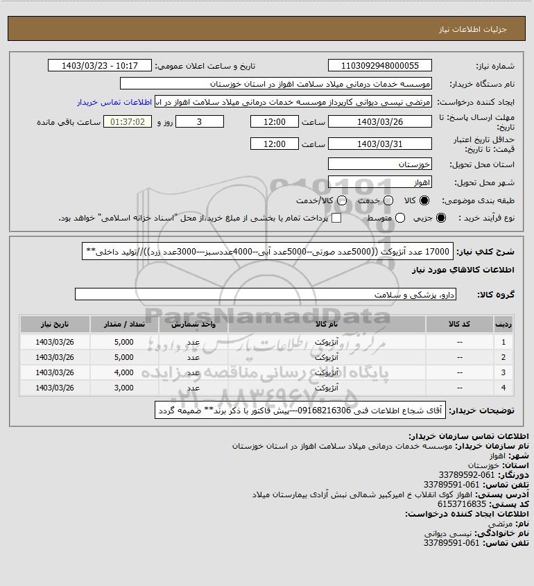 نام دستگاه خریدار:موسسه خدمات درمانی میلاد سلامت اهواز در استان خوزستان