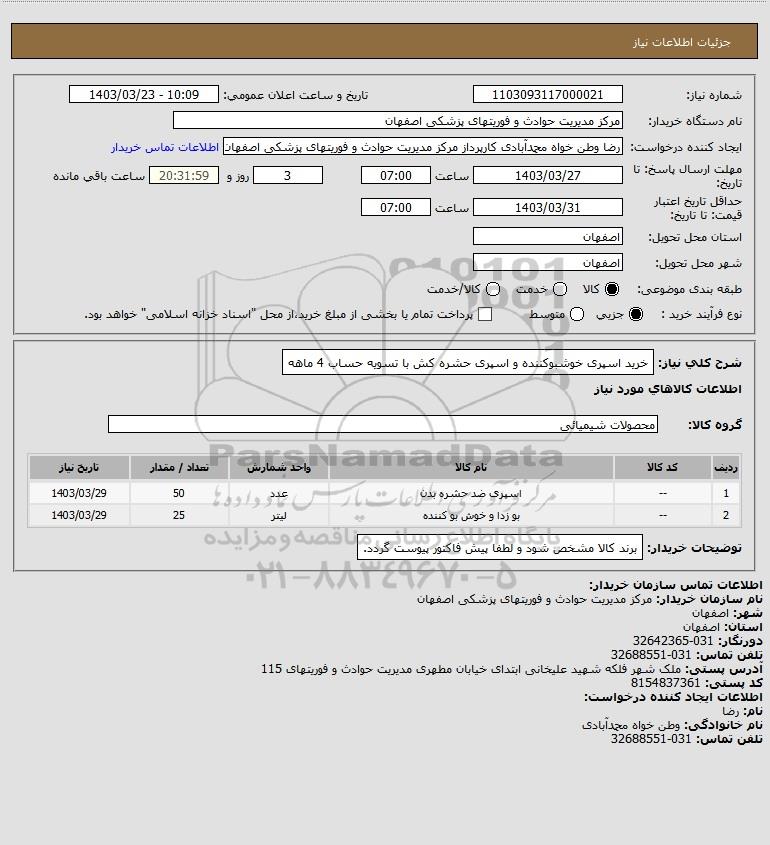 | 1 | -- | اسپری ضد حشره بدن | عدد | 50 | 1403/03/29 |