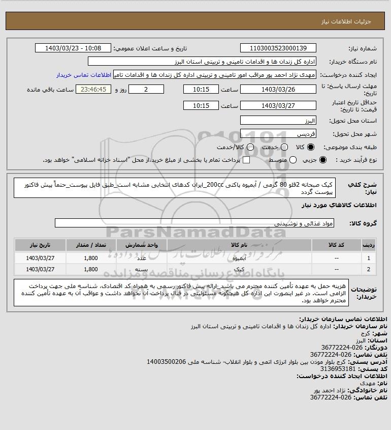 شرح کلی نیاز: کیک صبحانه 2قلو 80 گرمی / آبمیوه پاکتی 200cc_ایران کدهای انتخابی مشابه است_طبق فایل پیوست_حتماً پیش فاکتور پیوست گردد