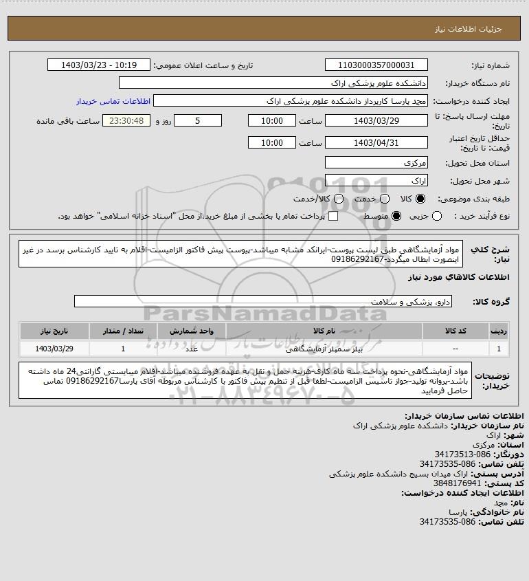 نام دستگاه خریدار:دانشکده علوم پزشکی اراک