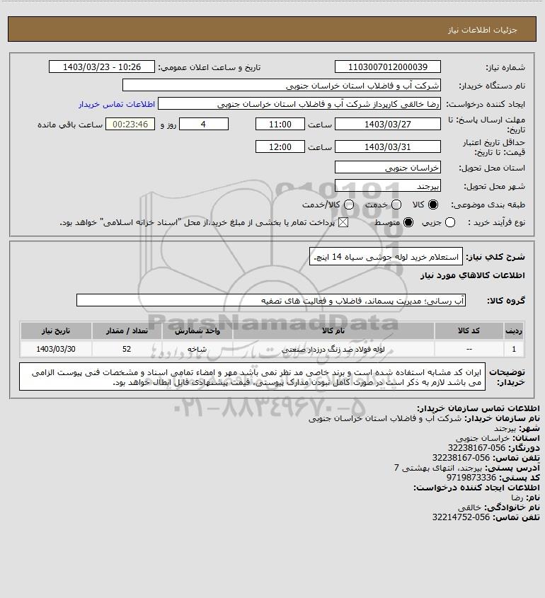 شرح کلی نیاز: استعلام خرید لوله جوشی سیاه 14 اینچ.