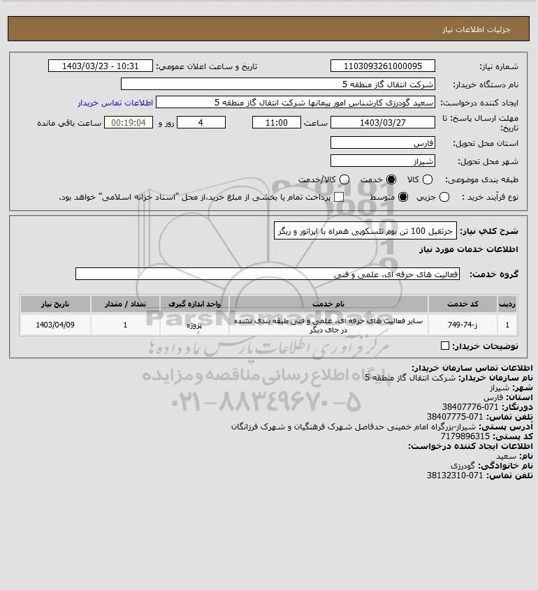 شرح کلی نیاز: جرثقیل 100 تن بوم تلسکوپی همراه با اپراتور و ریگر