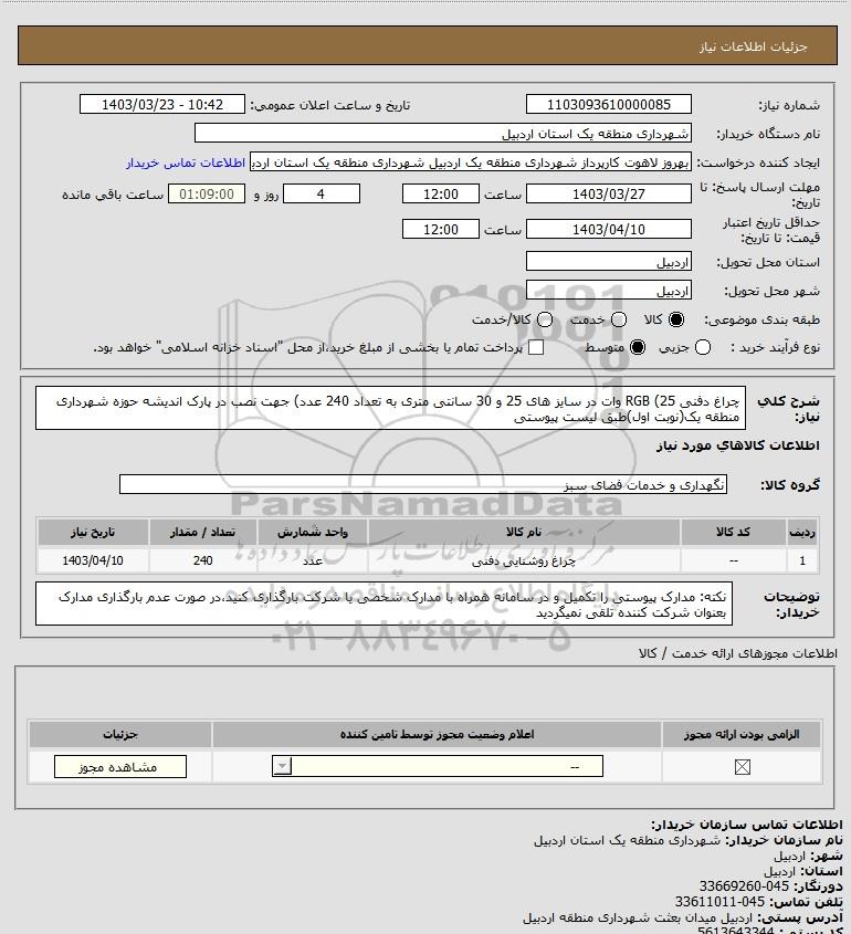 شرح کلی نیاز: چراغ دفنی RGB (25 وات در سایز های 25 و 30 سانتی متری به تعداد 240 عدد) جهت نصب در پارک اندیشه حوزه شهرداری منطقه یک(نوبت اول)طبق لیست پیوستی