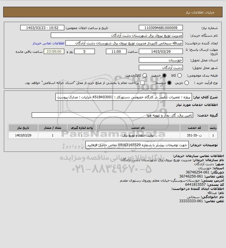 شرح کلی نیاز: پروژه : تعمیرات ترانس در کارگاه خصوصی دستورکار : 4518403001