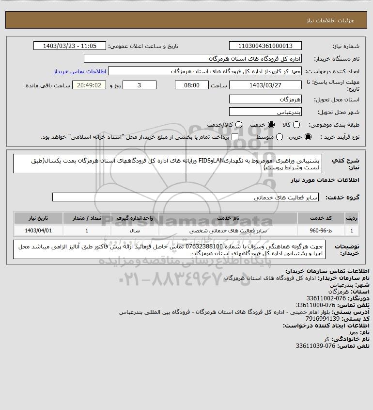 شرح کلی نیاز: پشتیبانی وراهبری امورمربوط به نگهداریLANوFIDS ورایانه های اداره کل فرودگاههای استان هرمزگان بمدت یکسال(طبق لیست وشرایط پیوست)