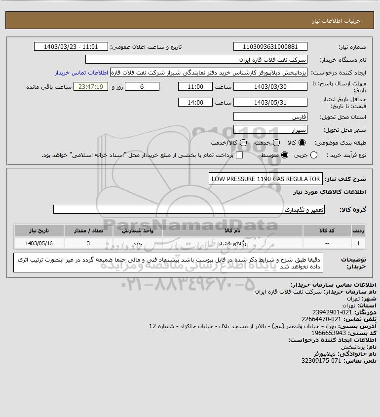 شرح کلی نیاز: LOW PRESSURE 1190 GAS REGULATOR