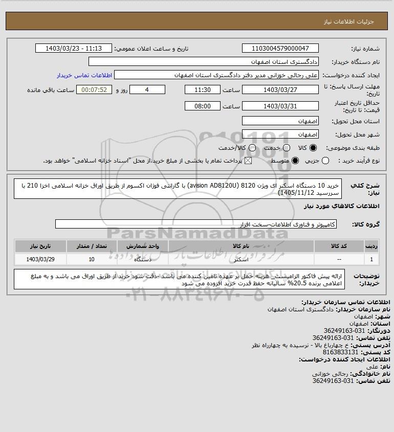 شرح کلی نیاز: خرید 10 دستگاه اسکنر ای ویژن 8120 (avision AD8120U) با گارانتی فوژان اکسوم از طریق اوراق خزانه اسلامی اخزا 210 با سررسید 1405/11/12)
