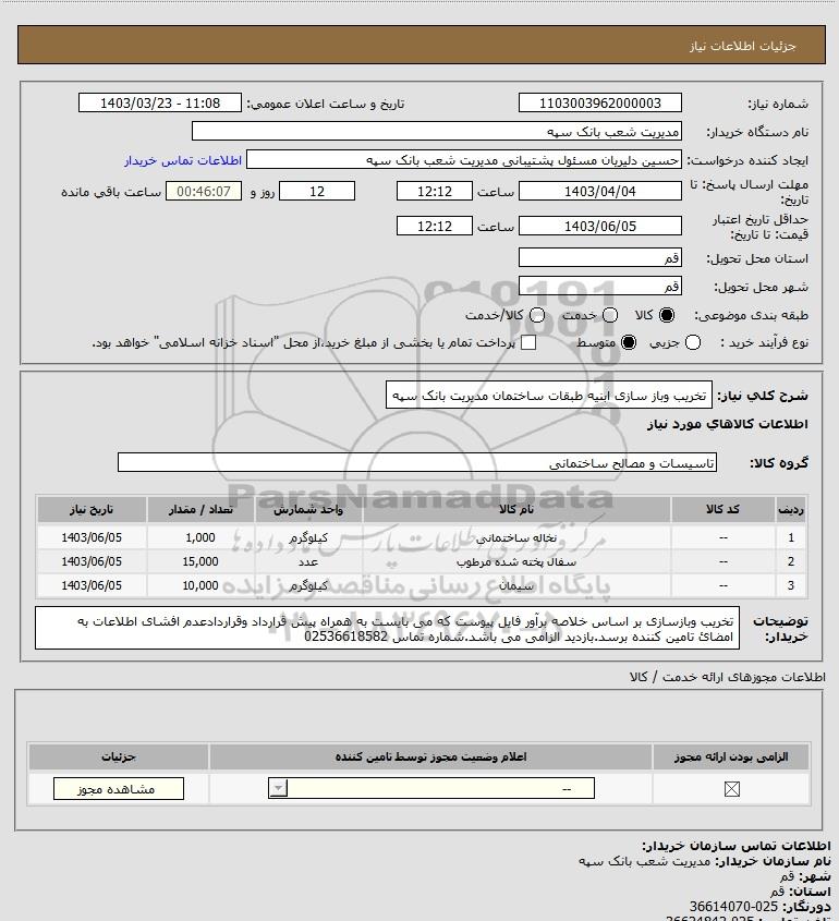 | 3 | -- | سیمان | کیلوگرم | 10,000 | 1403/06/05 |