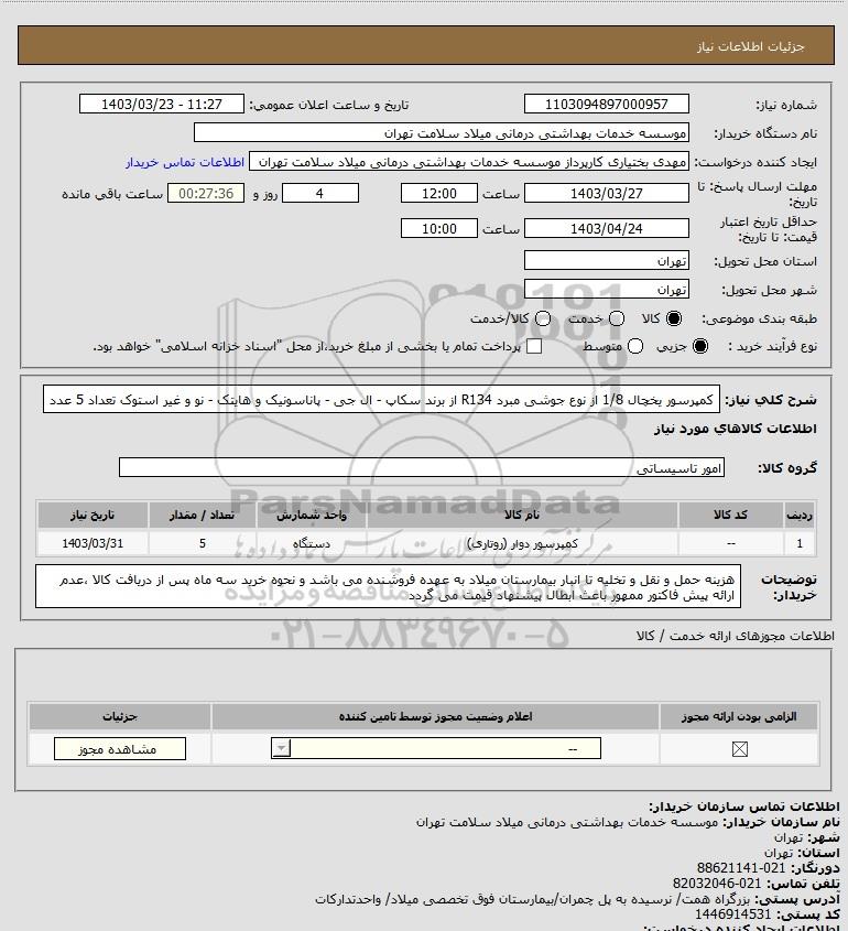 نام دستگاه خریدار:موسسه خدمات بهداشتی درمانی میلاد سلامت تهران