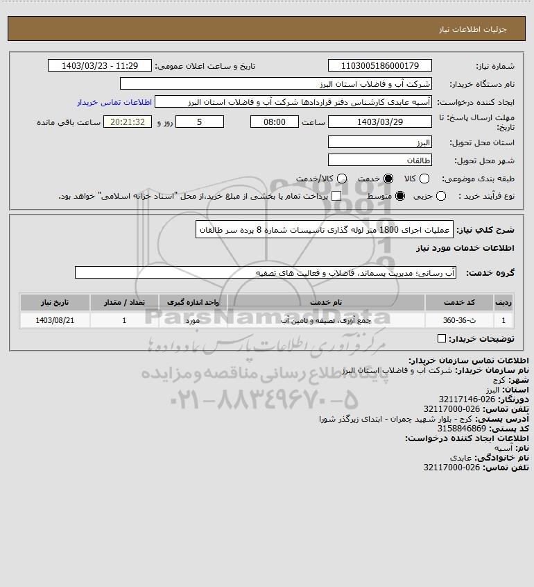 شرح کلی نیاز: عملیات اجرای 1800 متر لوله گذاری تاسیسات شماره 8 پرده سر طالقان