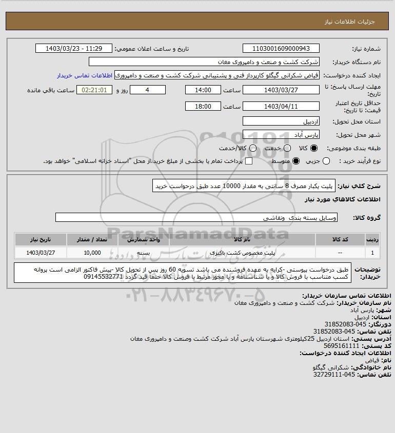 شرح کلی نیاز: پلیت یکبار مصرف 8 سانتی به مقدار 10000 عدد طبق درحواست خرید