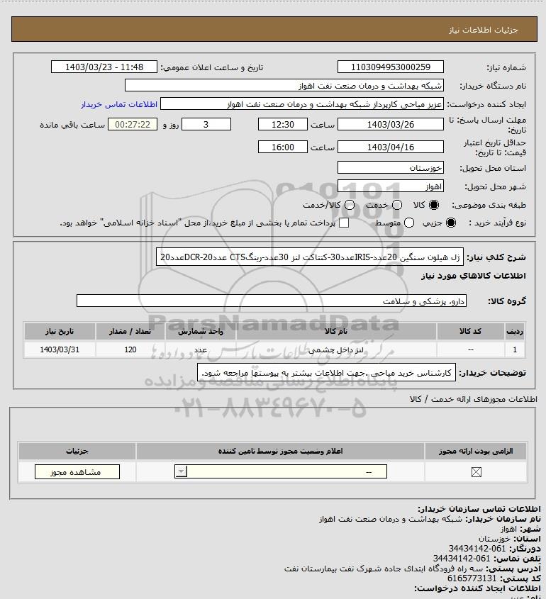شرح کلی نیاز: ژل هیلون سنگین 20عدد-IRISعدد30-کنتاکت لنز 30عدد-رینگCTS عدد20-DCRعدد20