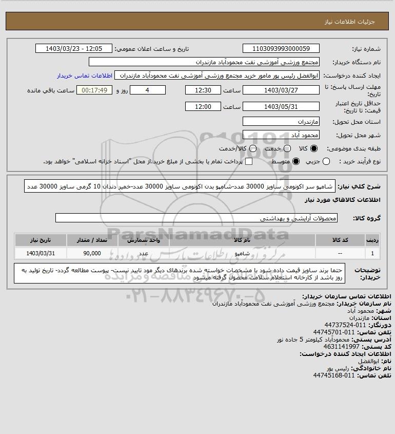 شرح کلی نیاز: شامپو سر اکونومی ساویز 30000 عدد-شامپو بدن اکونومی ساویز 30000 عدد-خمیر دندان 10 گرمی ساویز 30000 عدد