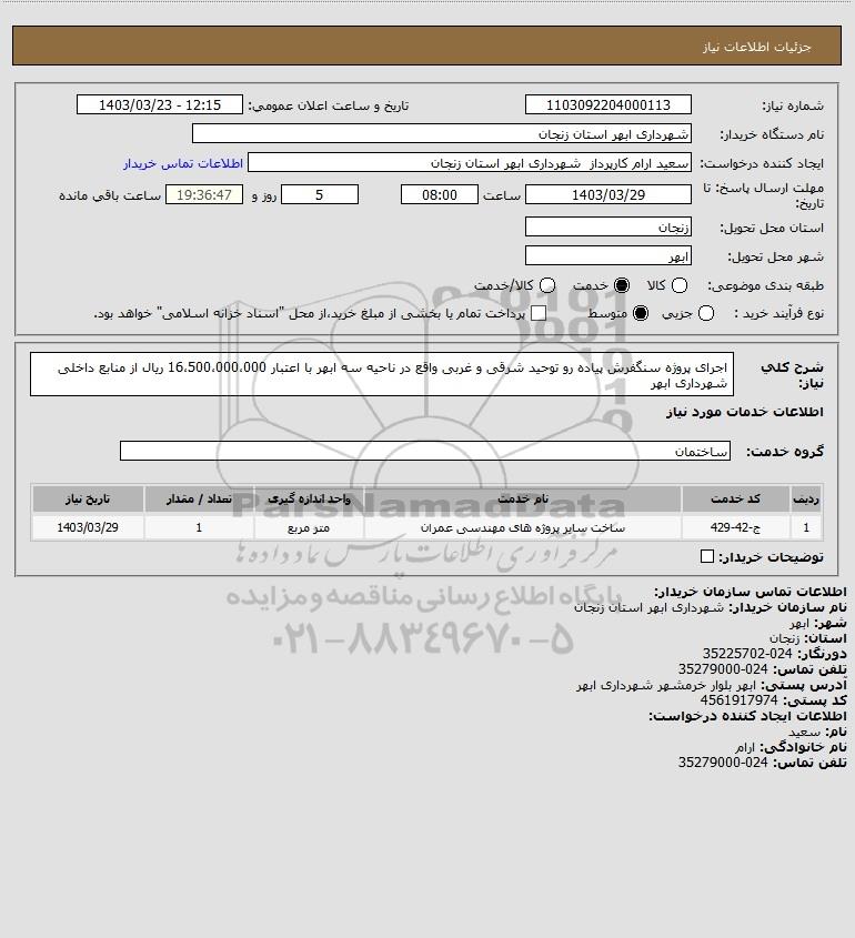 شرح کلی نیاز: اجرای پروژه سنگفرش پیاده رو توحید شرقی و غربی واقع در ناحیه سه ابهر با اعتبار 16،500،000،000 ریال از منابع داخلی شهرداری ابهر
