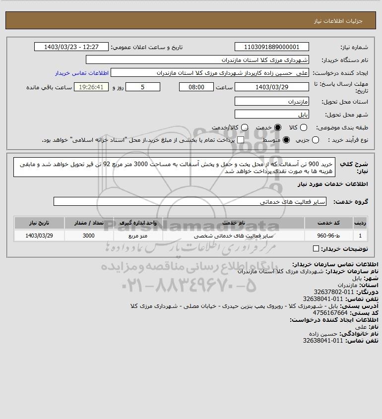 شرح کلی نیاز: خرید 900 تن آسفالت که از محل پخت و حمل و پخش آسفالت به مساحت 3000 متر مربع 92 تن قیر تحویل خواهد شد و مابقی هزینه ها به صورت نقدی پرداخت خواهد شد
