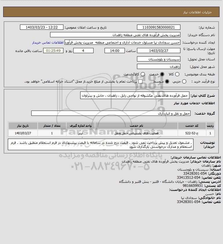 شرح کلی نیاز: حمل فرآورده های نفتی مکشوفه از نواحی زابل ، زاهدان ، خاش و سراوان