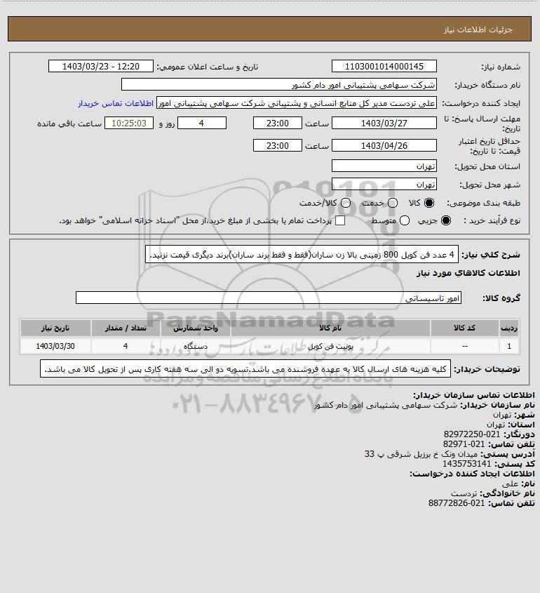شرح کلی نیاز: 4 عدد فن کویل 800 زمینی بالا زن ساران(فقط و فقط برند ساران)برند دیگری قیمت نزنید.