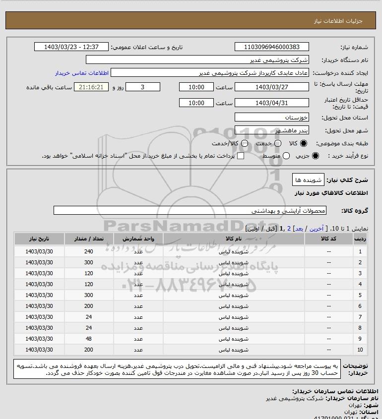 | 10 | -- | شوینده لباس | عدد | 200 | 1403/03/30 |