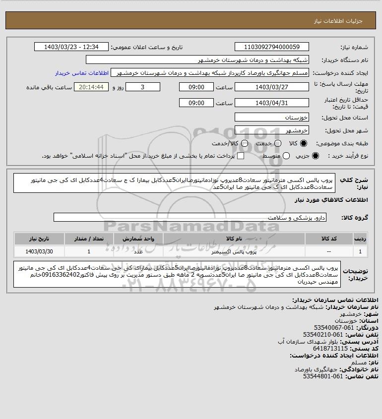 | 1 | -- | پروب پالس اکسیمتر | عدد | 1 | 1403/03/30 |