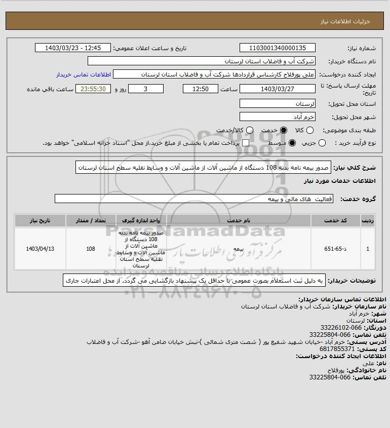 شرح کلی نیاز: صدور بیمه نامه بدنه 108 دستگاه از ماشین آلات از ماشین آلات و وسایط نقلیه سطح استان لرستان