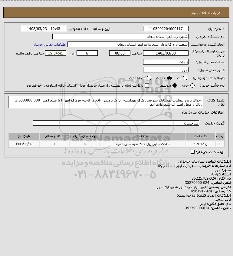شرح کلی نیاز: اجرای پروژه عملیات بهسازی سرویس های بهداشتی پارک پردیس واقع در ناحیه مرکزی ابهر را با مبلغ اعتبار 3،500،000،000 ریال از محل اعتبارات شهرداری ابهر