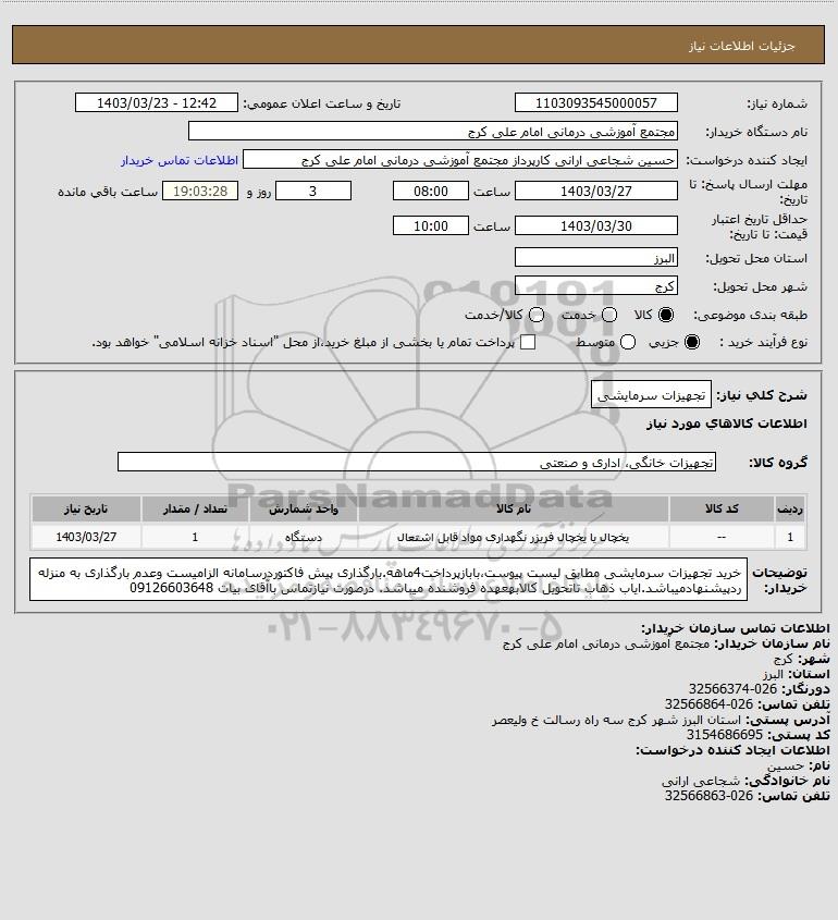 | 1 | -- | یخچال یا یخچال فریزر نگهداری مواد قابل اشتعال | دستگاه | 1 | 1403/03/27 |