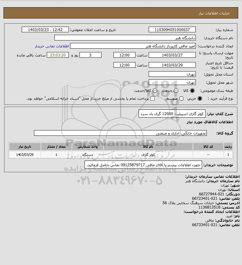 شرح کلی نیاز: کولر گازی اسپیلیت 12000 گری باد سرد