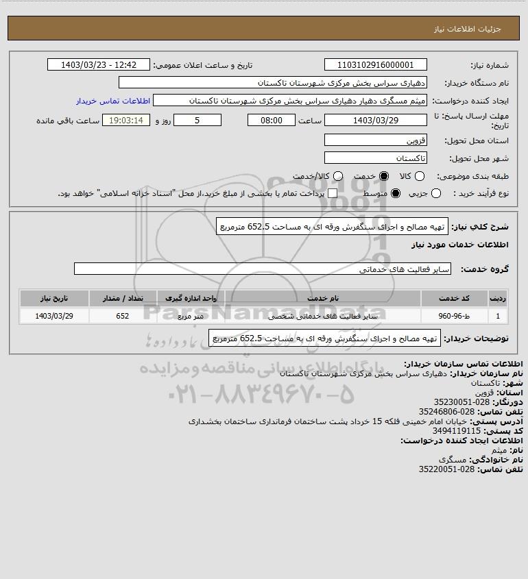 شرح کلی نیاز: تهیه مصالح و اجرای سنگفرش ورقه ای به مساحت 652.5 مترمربع