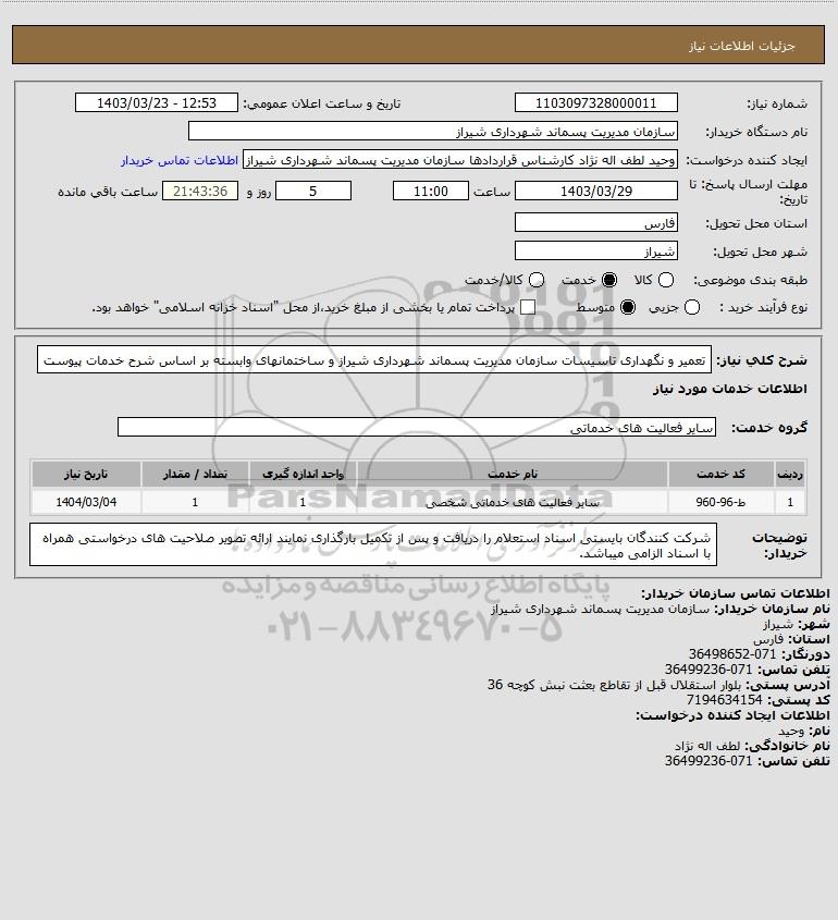 شرح کلی نیاز: تعمیر و نگهداری تاسیسات سازمان مدیریت پسماند شهرداری شیراز و ساختمانهای وابسته بر اساس شرح خدمات پیوست
