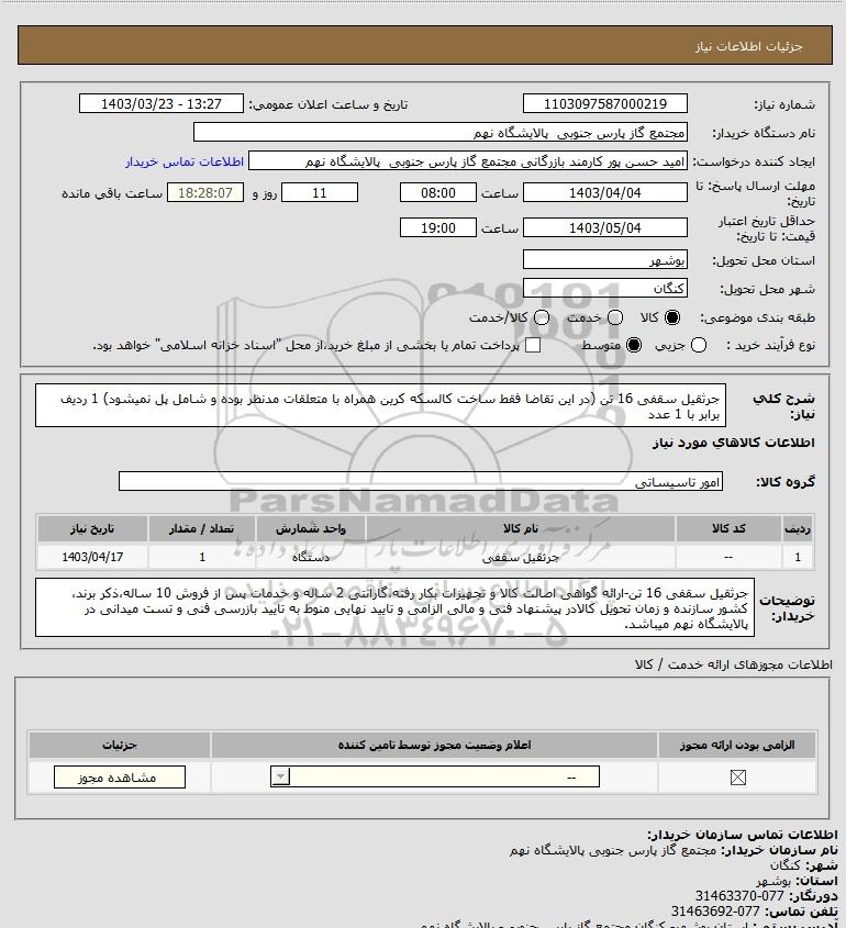 | 1 | -- | جرثقیل سقفی | دستگاه | 1 | 1403/04/17 |