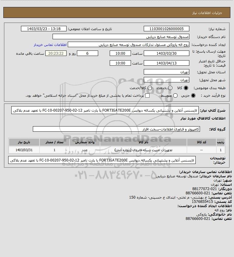 | 1 | -- | تجهیزات امنیت شبکه فایروال (دیواره آتش) | عدد | 1 | 1403/03/31 |