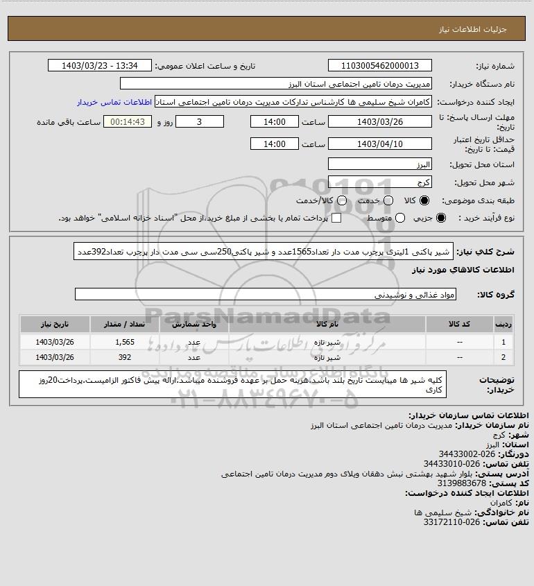 شرح کلی نیاز: شیر پاکتی 1لیتری پرچرب مدت دار تعداد1565عدد و شیر پاکتی250سی سی مدت دار پرچرب تعداد392عدد