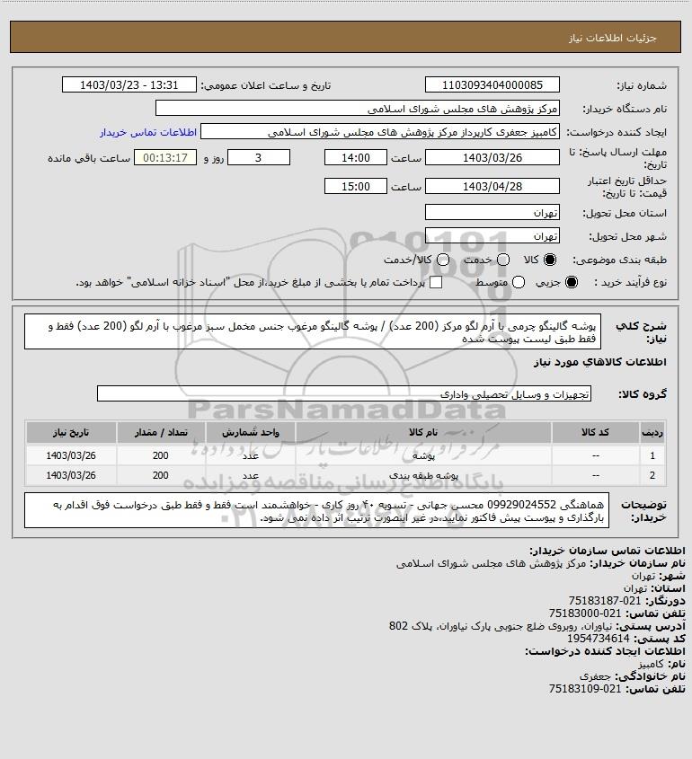 نام دستگاه خریدار:مرکز پژوهش های مجلس شورای اسلامی