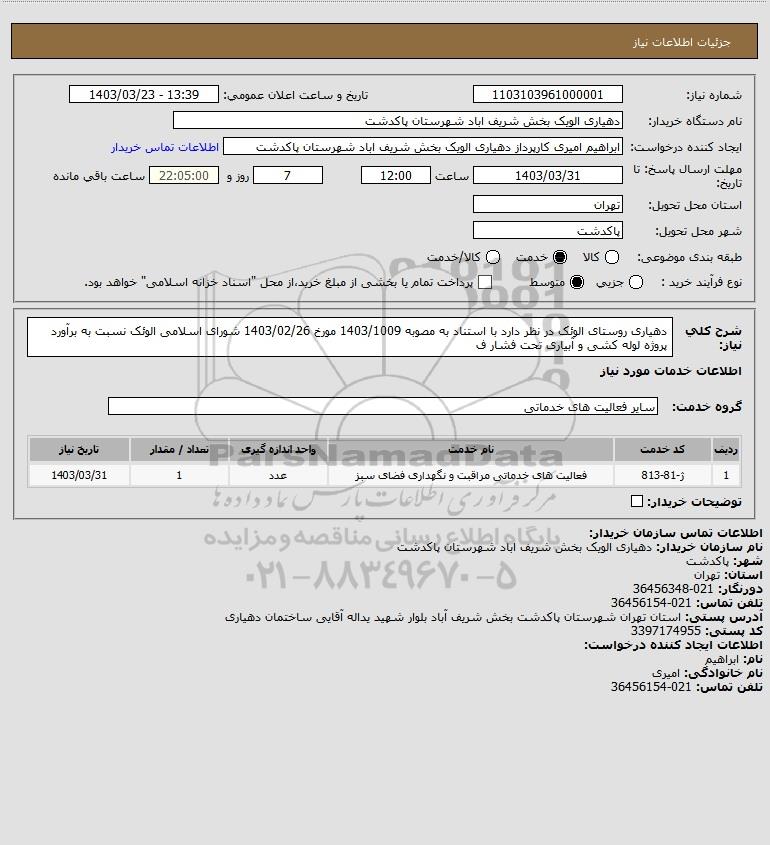 نام دستگاه خریدار:دهیاری الویک بخش شریف اباد شهرستان پاکدشت
