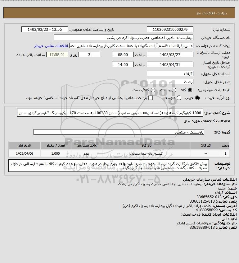 | 1 | -- | کیسه زباله بیمارستانی | عدد | 1,000 | 1403/04/06 |