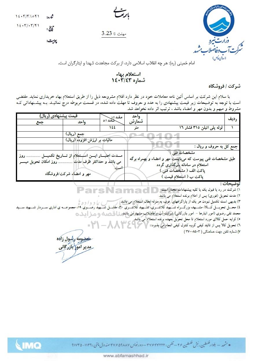 شرکت / فروشگاه با سلام این شرکت بر اساس آئین نامه معاملات خود در نظر دارد اقلام مشروحه ذیل را از طریق استعلام بهاء خریداری نماید. مقتضی است با توجه به توضیحات زیر قیمت پیشنهادی را به عدد و حروف تا مهلت داده شده در قسمت مربوطه درج نمائید. به پیشنهاداتی که مشروط و مبهم و بدون مهر و امضاء باشد و یا بعد از موعد مقرر تحویل داده شود ترتیب اثر داده نخواهد
