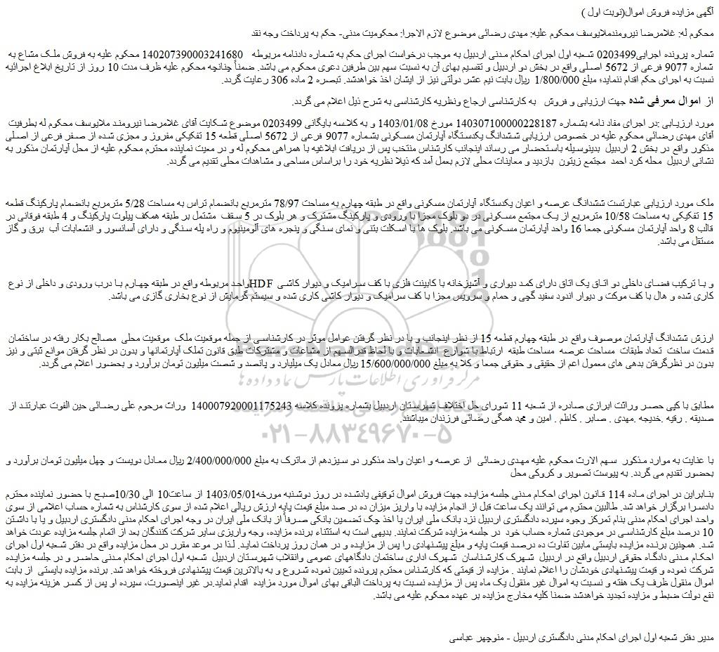 شماره پرونده اجرایی0203499 شعبه اول اجرای احکام مدنی اردبیل به موجب درخواست اجرای حکم به شماره دادنامه مربوطه   140207390003241680 محکوم علیه به فروش ملک مشاع به شماره 9077 فرعی از 5672 اصلی واقع در بخش دو اردبیل و تقسیم بهای آن به نسبت سهم بین طرفین دعوی محکوم می باشد. ضمناً چنانچه محکوم علیه ظرف مدت 10 روز از تاریخ ابلاغ اجرائیه نسبت به اجرای حکم اقدام ننماید؛ مبلغ 1/800/000  ریال بابت نیم عشر دولتی نیز از ایشان اخذ خواهدشد. تبصره 2 ماده 306 رعایت گردد.