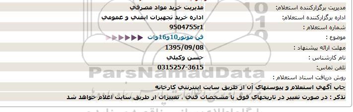 استعلام بها و موضوع استعلام استعلام , استعلام فن موتور 10 و 16 وات به اطلاع کلیه شرکتها و افراد متخصص واجد شرایط میرساند، آگهی گذار در نظر دارد از طریق استعلام بها، نسبت به انتخاب و دریافت پیشنهادات اقدام نماید. این استعلام با کد آگهی ثبت شده در سامانه خبرگزاری پارس نماد : 758664 منتشر شده است. مشخصات استعلام : تاریخ شروع استعلام: 1395/09/03 آخرین مهلت ارسال پیشنهاد قیمت : 1395/09/08 و محل اجرای پروژه : استان اصفهان میباشد. استعلام قیمت مورد درخواست : استعلام , استعلام فن موتور 10 و 16 وات با دستهبندیهای تخصصی و گروه های مرتبط : تجهیزات و ماشین آلات صنعتی, استعلام اطلاع رسانی میگردد.
