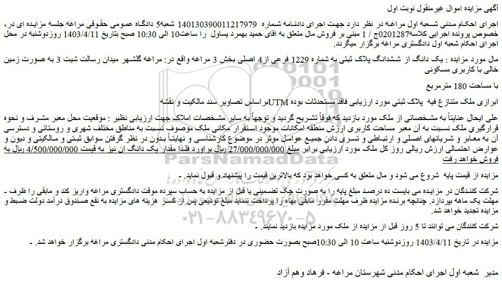 مزایده فروش یک دانگ از ششدانگ پلاک ثبتی به شماره 1229 فرعی از4 اصلی, مزایده فروش یک دانگ از ششدانگ پلاک ثبتی به شماره 1229 فرعی از4 اصلی