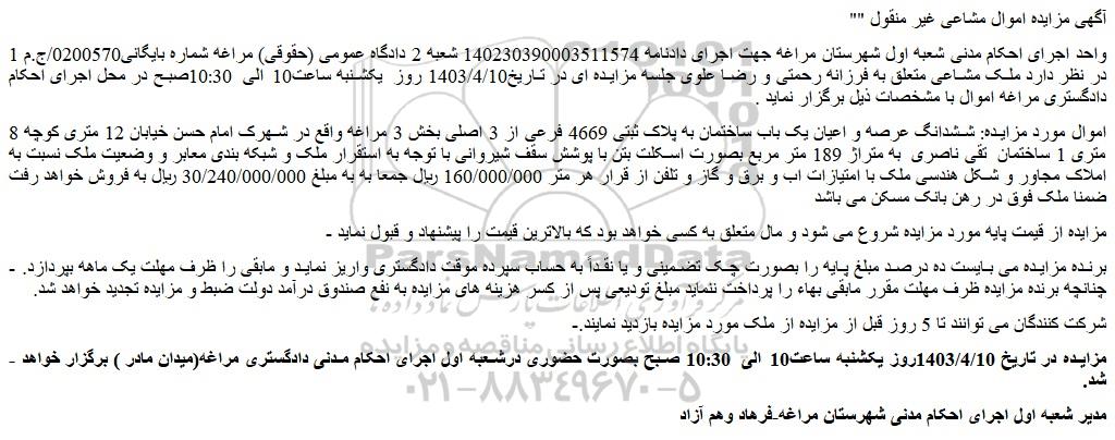 - مزایده در تاریخ 1403/4/10روز یکشنبه ساعت10 الی 10:30 صبح بصورت حضوری درشعبه اول اجرای احکام مدنی دادگستری مراغه(میدان مادر ) برگزار خواهد شد.