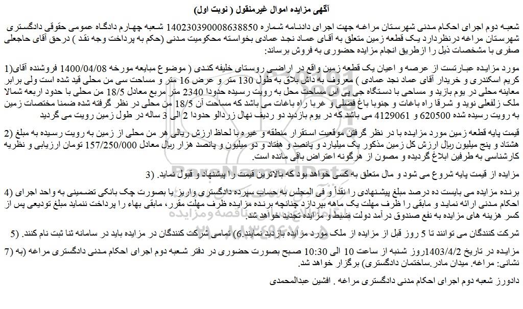 شعبه دوم اجرای احکام مدنی شهرستان مراغه جهت اجرای دادنامه شماره 140230390008638850 شعبه چهارم دادگاه عمومی حقوقی دادگستری شهرستان مراغه درنظردارد یک قطعه زمین متعلق به آقای عماد نجد عمادی بخواسته محکومیت مدنی (حکم به پرداخت وجه نقد ) درحق آقای حاجعلی صفری با مشخصات ذیل را ازطریق انجام مزایده حضوری به فروش برساند: