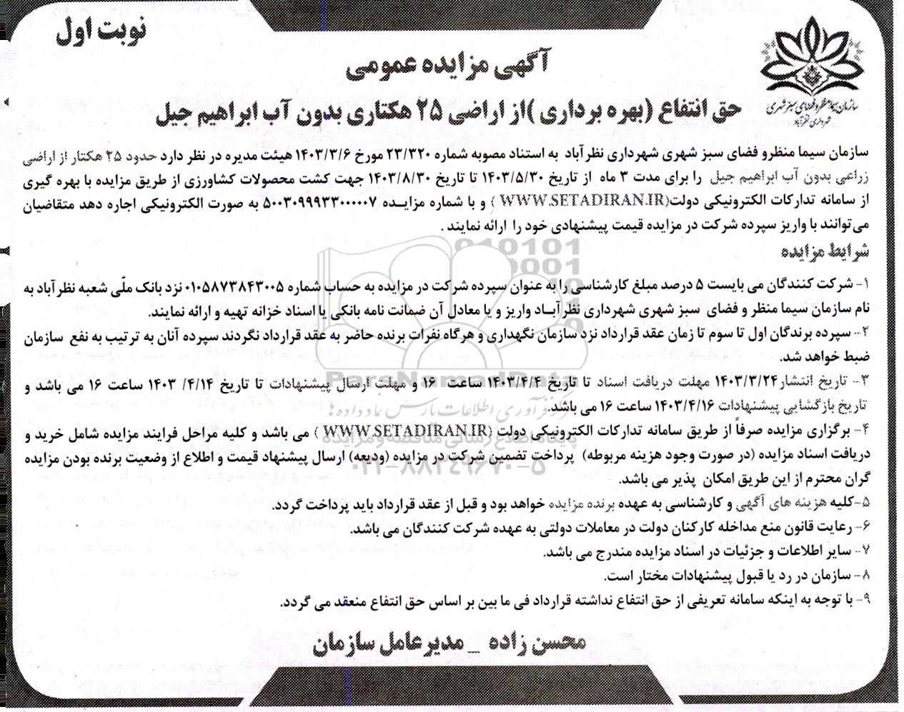 سازمان سیما منظر و فضای سبز شهری شهرداری نظرآباد در نظر دارد حدود ۲۵ هکتار از اراضی زراعی بدون آب ابراهیم جیل را برای مدت ۳ ماه از تاریخ 1403.5.30 تا تاریخ 1403.8.30 جهت کشت محصولات کشاورزی از طریق مزایده با بهره گیری از سامانه تدارکات الکترونیکی دولت ستاد ایران و با شماره مزایده 5003099933000007 به صورت الکترونیکی اجاره دهد متقاضیان می توانند با واریز سپرده شرکت در مزایده قیمت پیشنهادی خود را ارائه نمایند.
