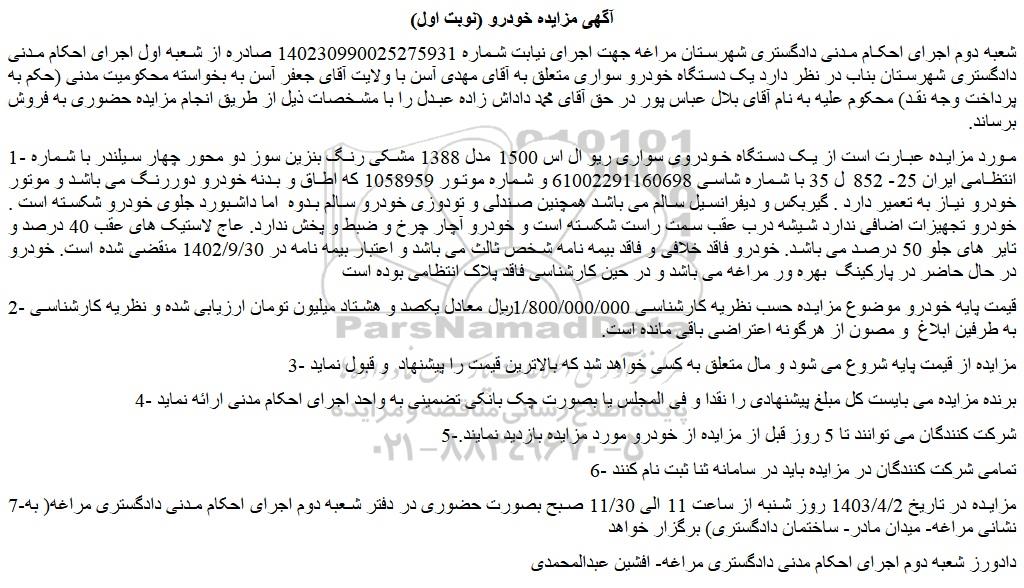 شعبه دوم اجرای احکام مدنی دادگستری شهرستان مراغه جهت اجرای نیابت شماره 140230990025275931 صادره از شعبه اول اجرای احکام مدنی دادگستری شهرستان بناب در نظر دارد یک دستگاه خودرو سواری متعلق به آقای مهدی آسن با ولایت آقای جعفر آسن به بخواسته محکومیت مدنی (حکم به پرداخت وجه نقد) محکوم علیه به نام آقای بلال عباس پور در حق آقای محمد داداش زاده عبدل را با مشخصات ذیل از طریق انجام مزایده حضوری به فروش برساند.