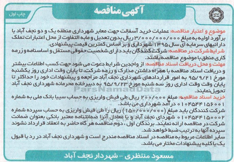 موضوع و اعتبار مناقصه: عملیات خرید آسفالت جهت معابر شهرداری منطقه یک و دو نجف آباد با برآورد اولیه به مبلغ 3.000.000.000 ریال بدون تعدیل و مابه التفاوت از محل اعتبارات تملک داراییهای سرمایه ای سال 95 شهرداری و براساس کمترین قیمت پیشنهادی